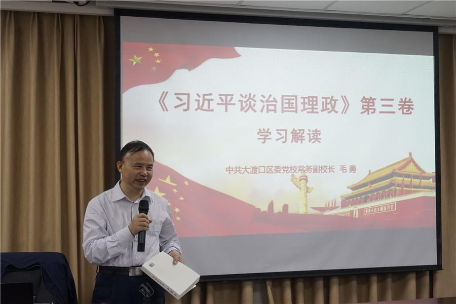 會(huì )議邀請區委黨校常務(wù)副校長(cháng)毛勇領(lǐng)學(xué)授課。主要從《習近平談治國理政》第三卷的時(shí)代背景、主題主線(xiàn)、主要內容、創(chuàng )新點(diǎn)、重大意義、學(xué)習建議等六個(gè)方面,圍繞深入學(xué)習習近平新時(shí)代中國特色社會(huì )主義思想進(jìn)行學(xué)習解讀。