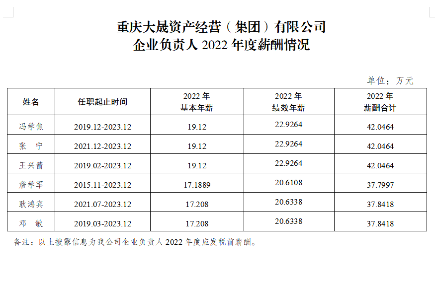 重慶大晟資產(chǎn)經(jīng)營(yíng)(集團)有限公司企業(yè)負責人2022年度薪酬情況